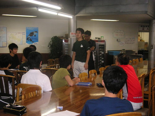 夜のミーティング。合宿前に全員が目標を立ててそれに向かって練習してきました。どんなことができるようになったのか、今後の課題は何か。一人一人が考えて、紙に書いて、発表をしました。