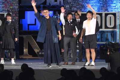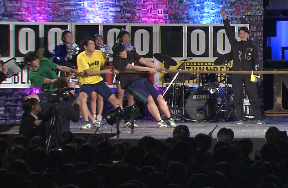 ステージの真下で、綱引きをする新応援団長の奮闘を撮影しています(IBS局員は左下)。