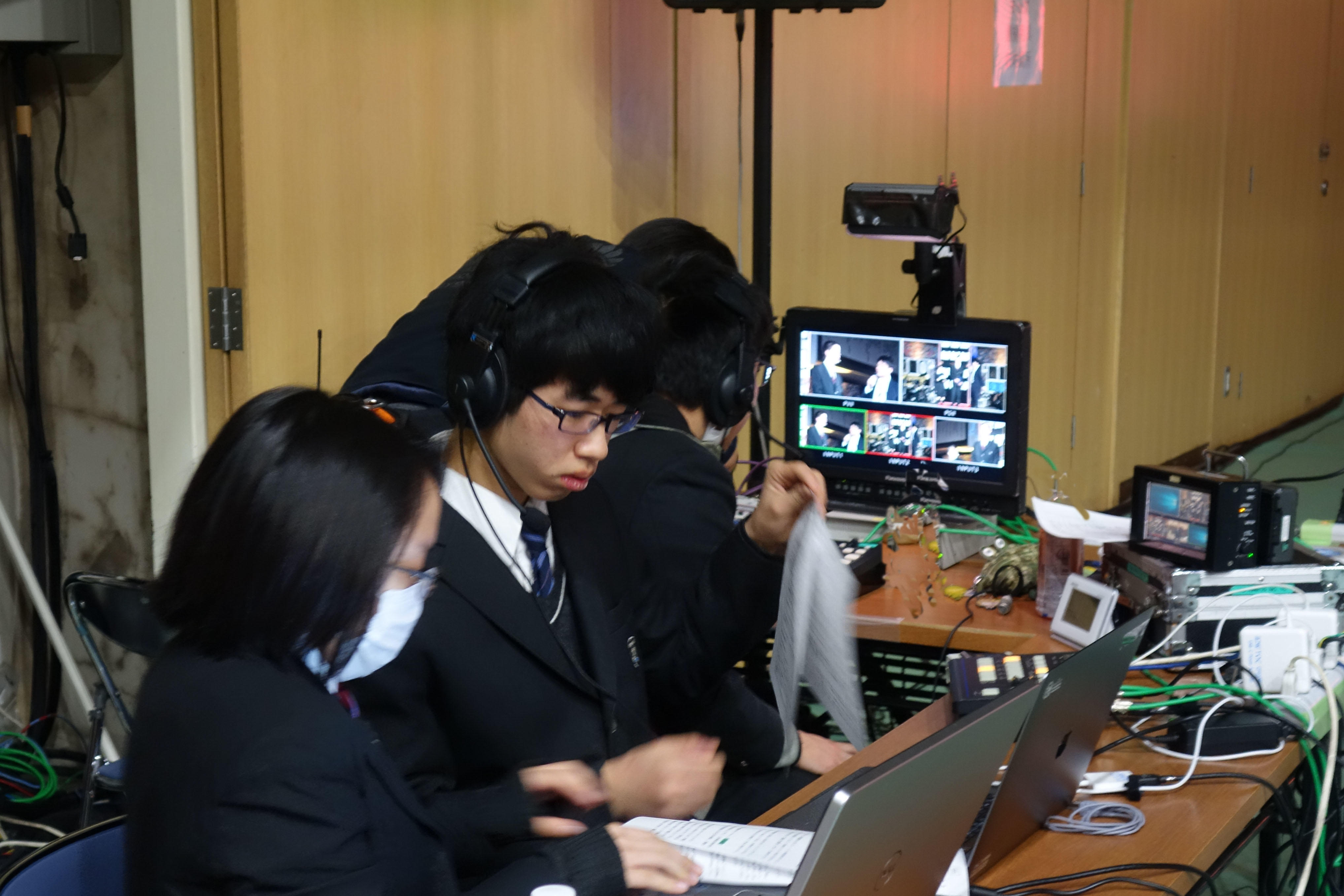 IBS局員がリハーサルでカメラワークの確認をしている様子と、スクリーンに投影する映像を切り替えるIBSの頭脳部分、ブースの様子です。