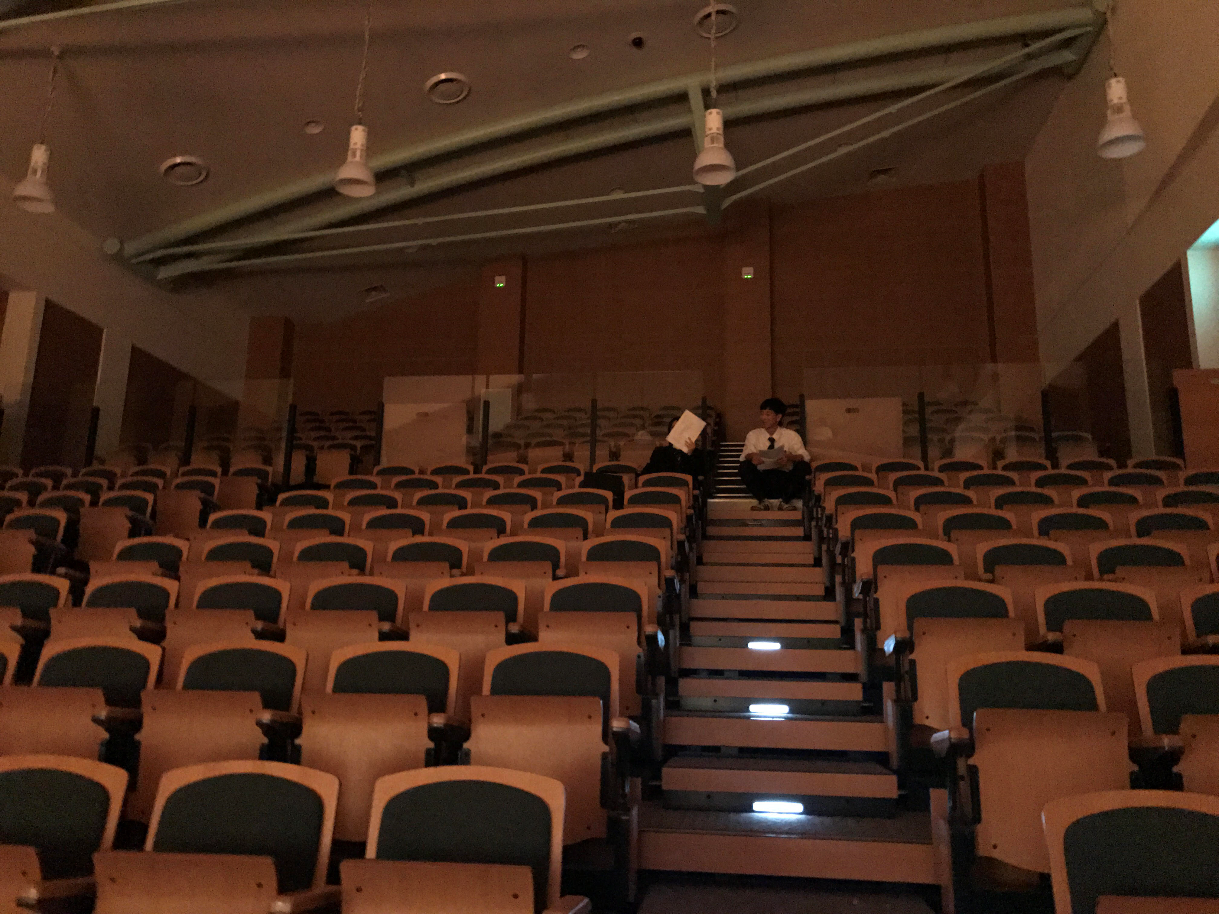 声の届き具合を確認するため、講堂座席部分の一番奥に行く生徒もいます。(写真三枚目)