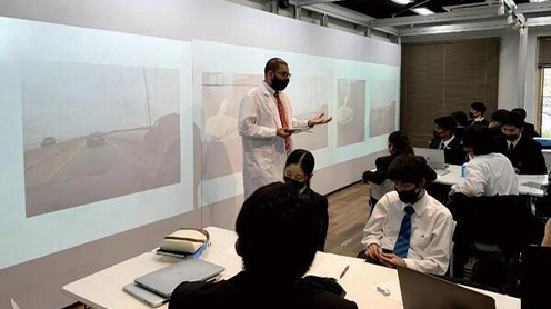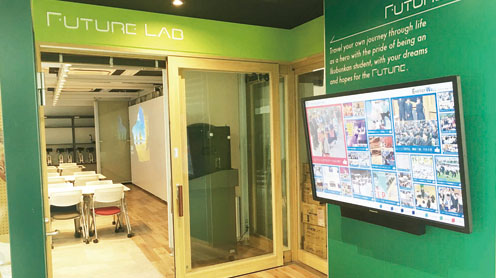 6台のプロジェクターと壁面を利用した巨大スクリーンのほか、最新型のパソコンや3DプリンターなどのICT機器を有する次世代型の学習施設「FUTURE LAB」が新たに誕生!留学生・海外姉妹校との遠隔授業や 理科実験の実演、プレゼンテーションやポスターセッションなど、実社会でも活用されているコミュニケーションやプレゼンテーション手法の先端を取り入れた授業を実現することで、グローバルな視点をより体験的に学ぶことができます。