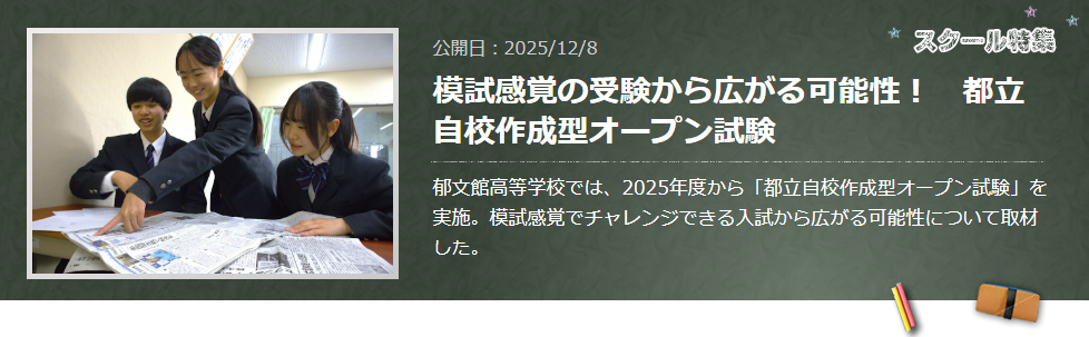外部メディアにて本校の「都立自校作成型オープン試験(都立オープン入試)」について、本入試で入学した生徒への取材記事が掲載されました。