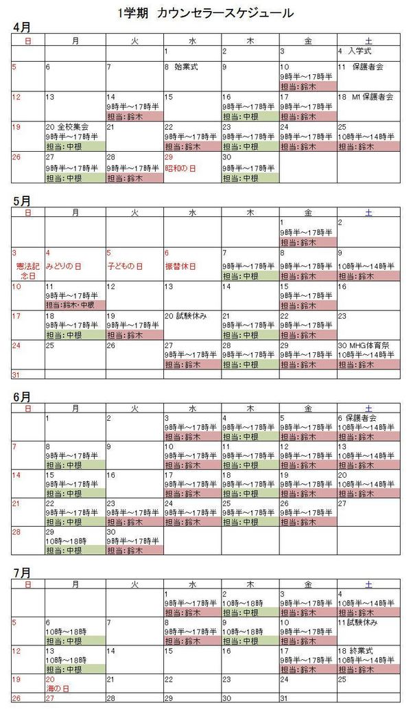 1学期 スクールカウンセラースケジュール