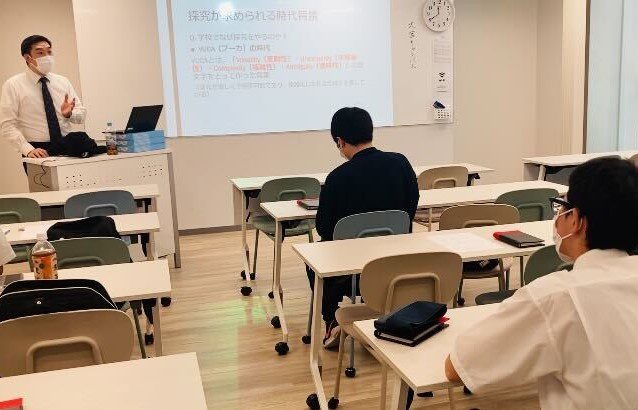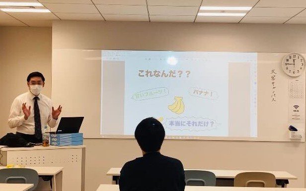 探究活動はID学園でも特に重きを置いている授業。昨今大学入試において総合型選抜(旧AO入試)の割合が多くなっていることもふくめ、探究学習が入試だけでなく今後の社会において生き抜いていくために重要なことであることを認識してもらい、オリエンテーション後はプチ探究活動として「バナナワーク」を行いました。