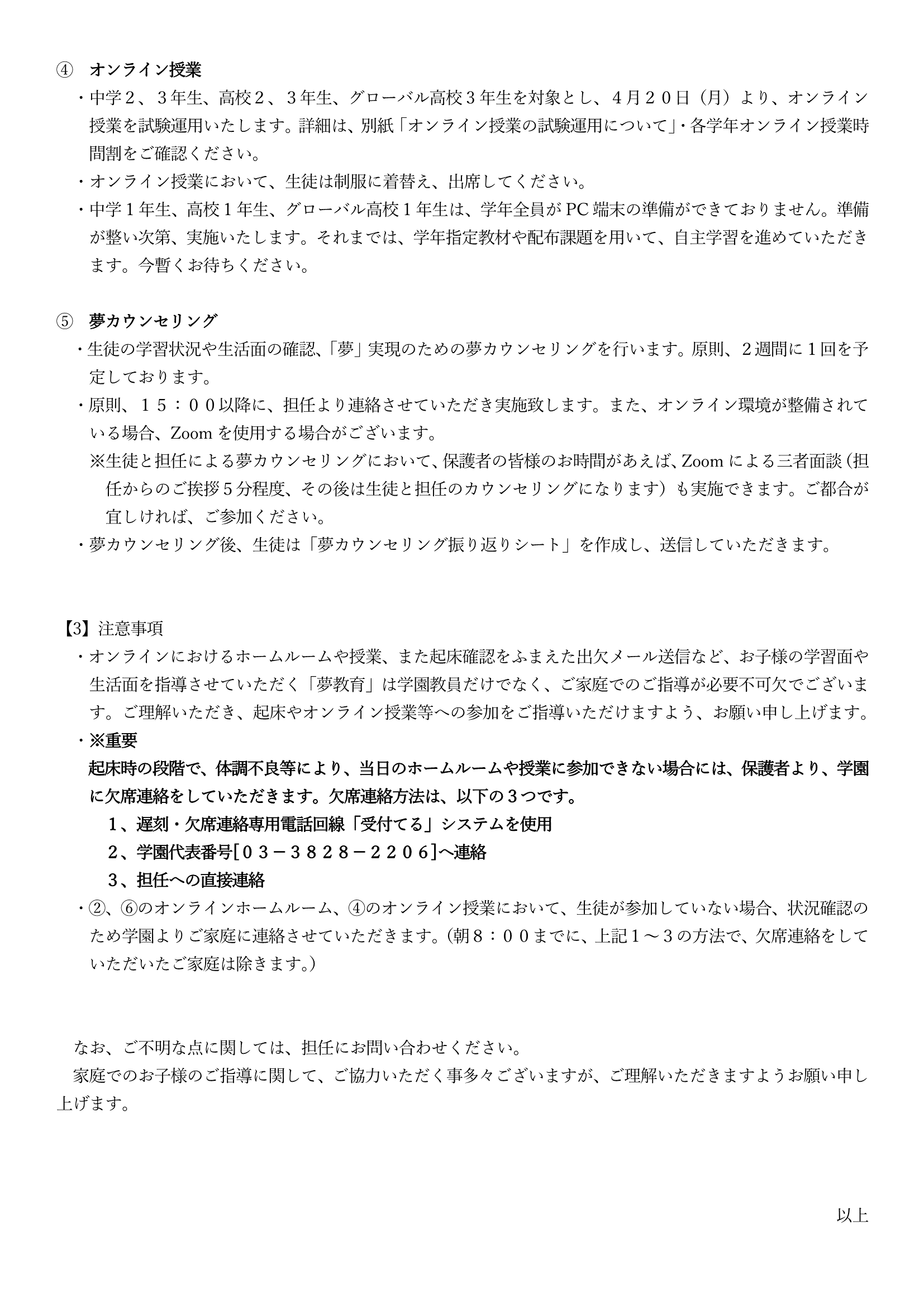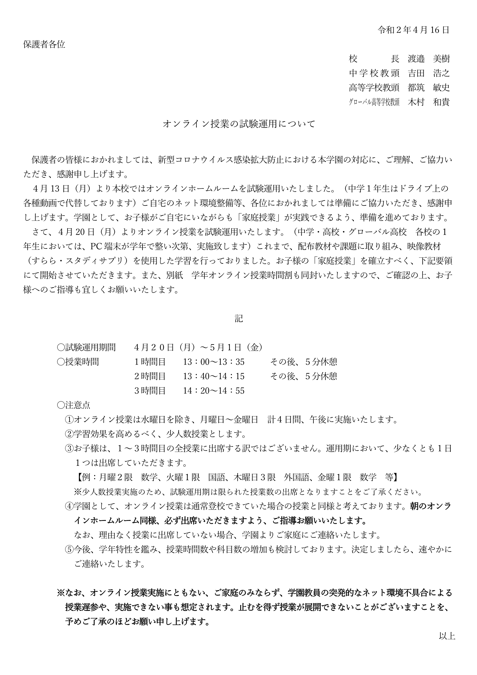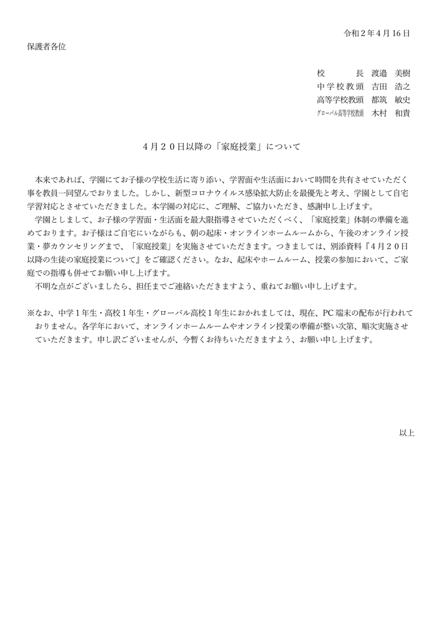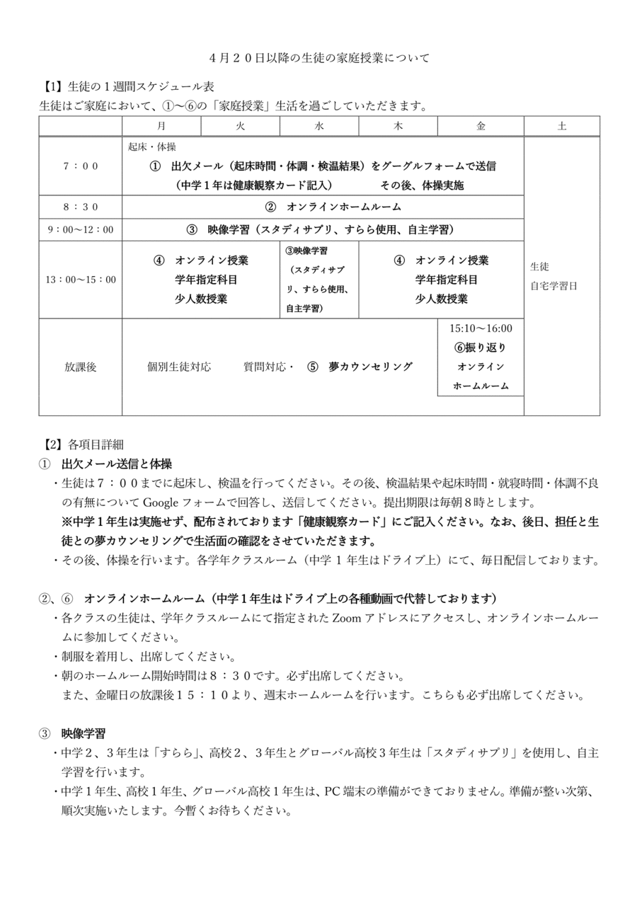 4月20日以降の「家庭授業(オンライン授業)」について