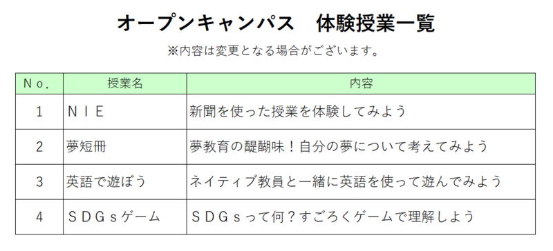 下記体験授業一覧からお選びいただき、予約申込時に選択いただきますようお願いいたします。