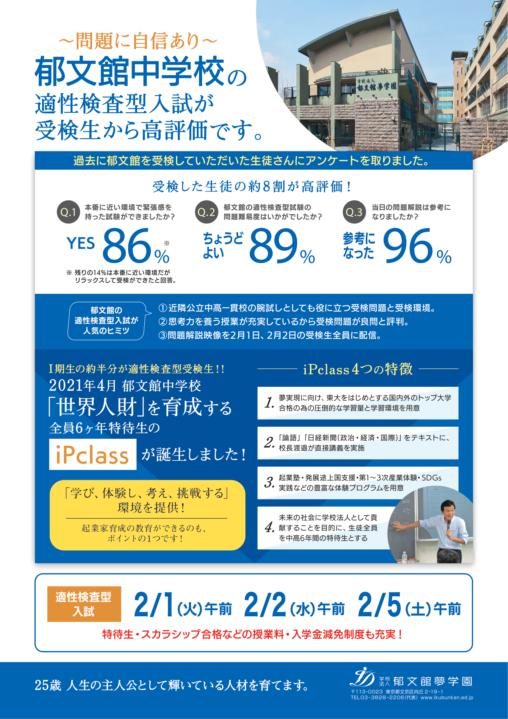 2021.12.25 郁文館中学校 適性検査型入試 学校説明会&入試問題傾向説明 動画はこちら