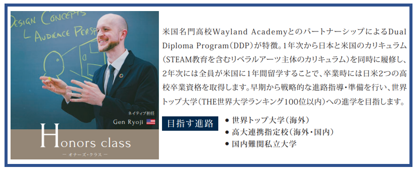 2024年度よりスタートする「Honorsクラス」は、入学者のうち成績優秀上位者が入学金・授業料免除の3ヵ年特待生となるクラスです。