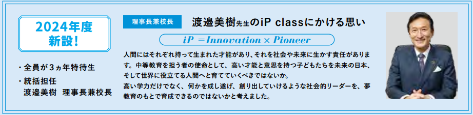 2024年度よりスタートする「iP class」は、渡邉美樹理事長兼校長が統括担任を務め、全員が入学金・授業料免除の3ヵ年特待生となるクラスです。