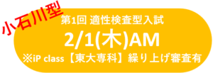 今年度の出題傾向は、2月1日(木)が小石川型、2月2日(金)が全適応型となり、どちらも6カ年特待のiP classへの繰り上げ審査があります。また、2月4日(日)は、国語・算数型のiP class選抜試験です。