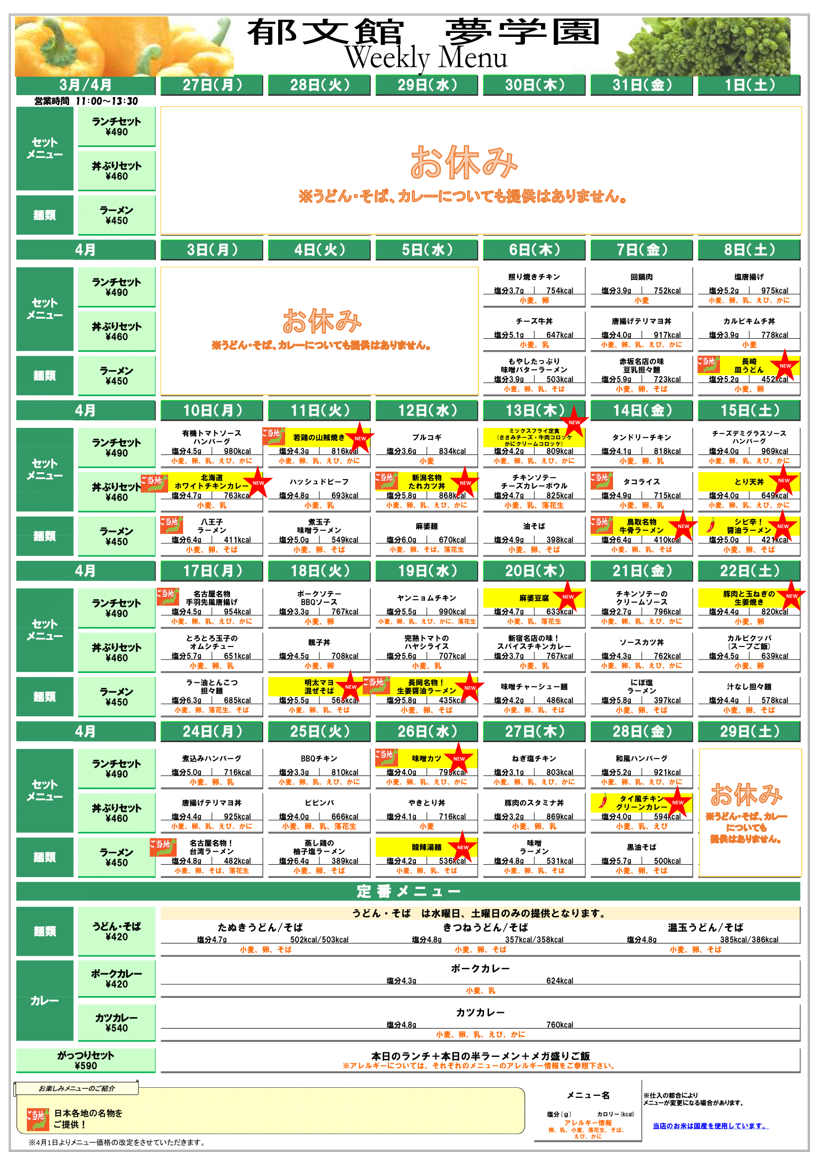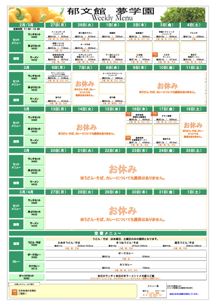 【お知らせ】 夢食堂2023年3月の献立をお知らせ致します。