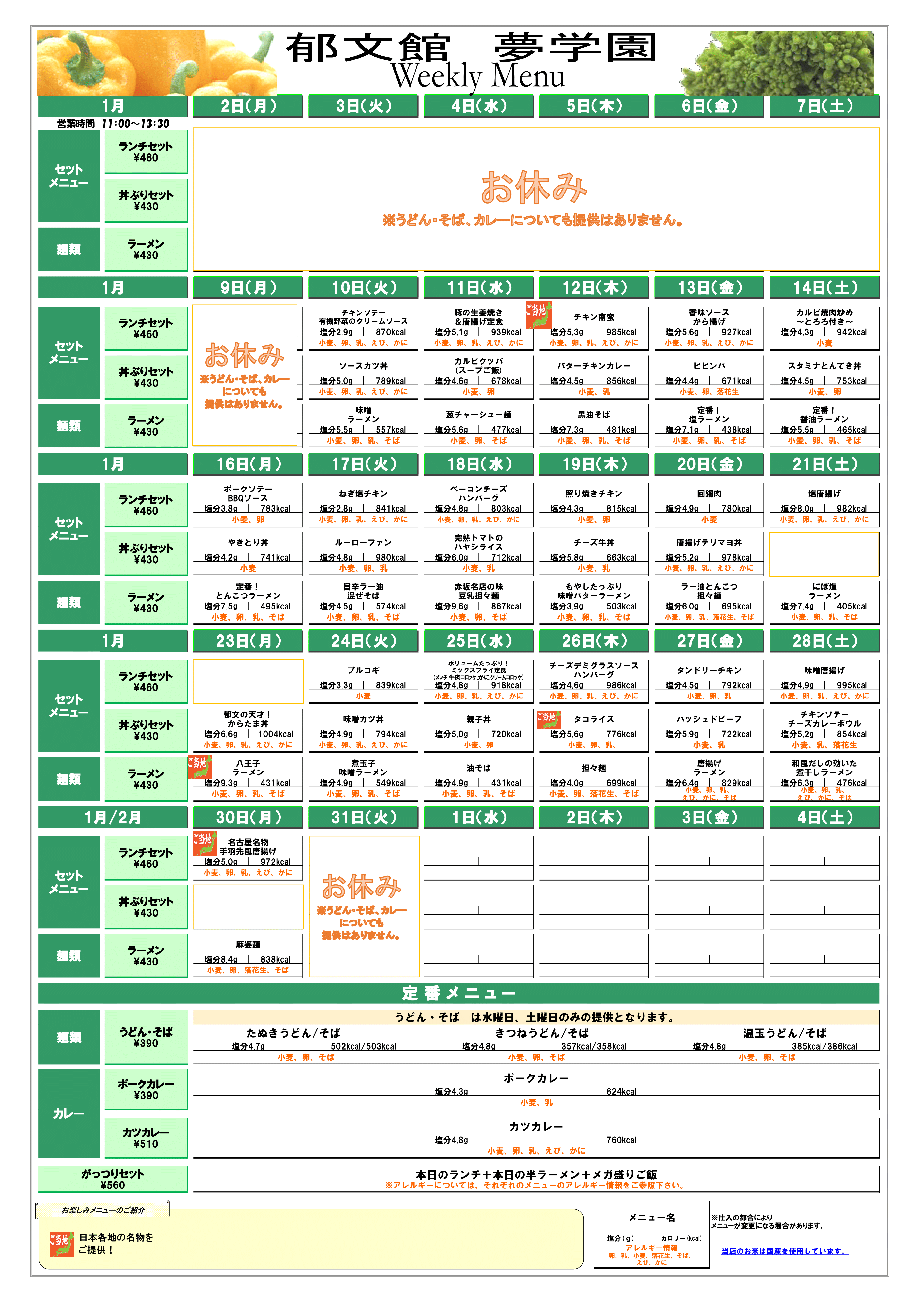 【お知らせ】 夢食堂2023年1月の献立をお知らせ致します。