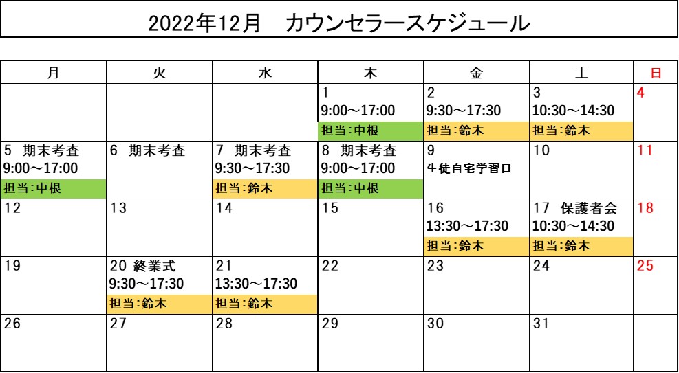 2022年12月カウンセラースケジュール
