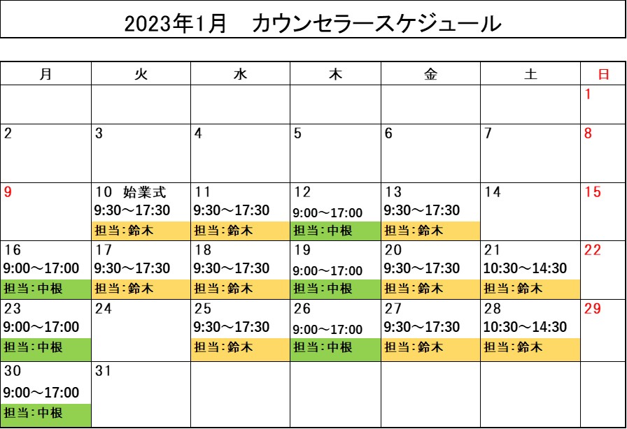 2023年1月カウンセラースケジュール