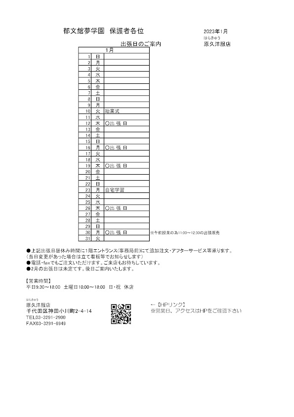 2023年1月 制服出張販売のご案内