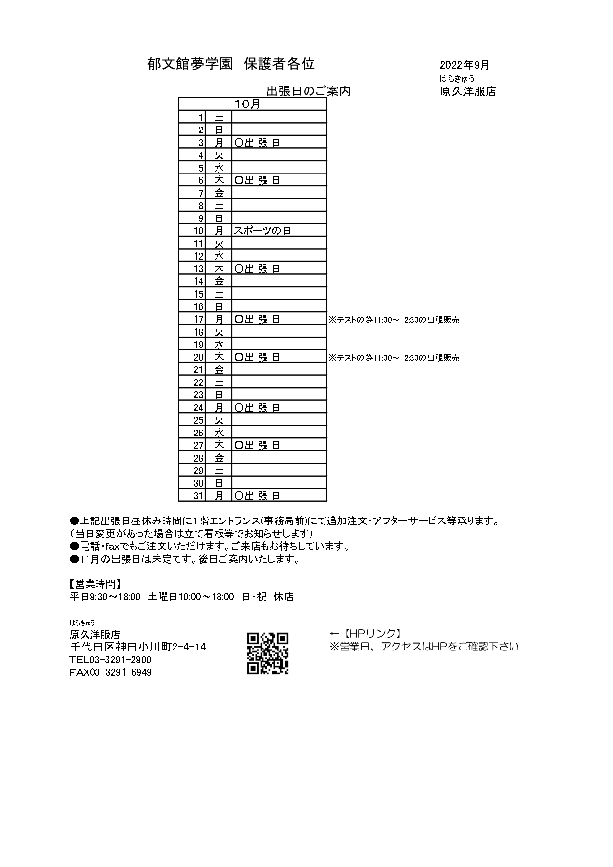 2022年10月 制服出張販売のご案内