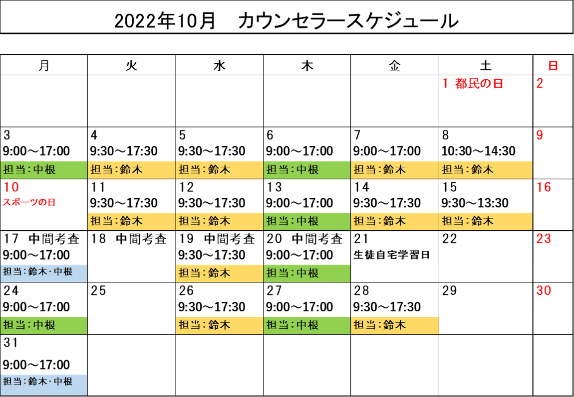 2022年10月カウンセラースケジュール