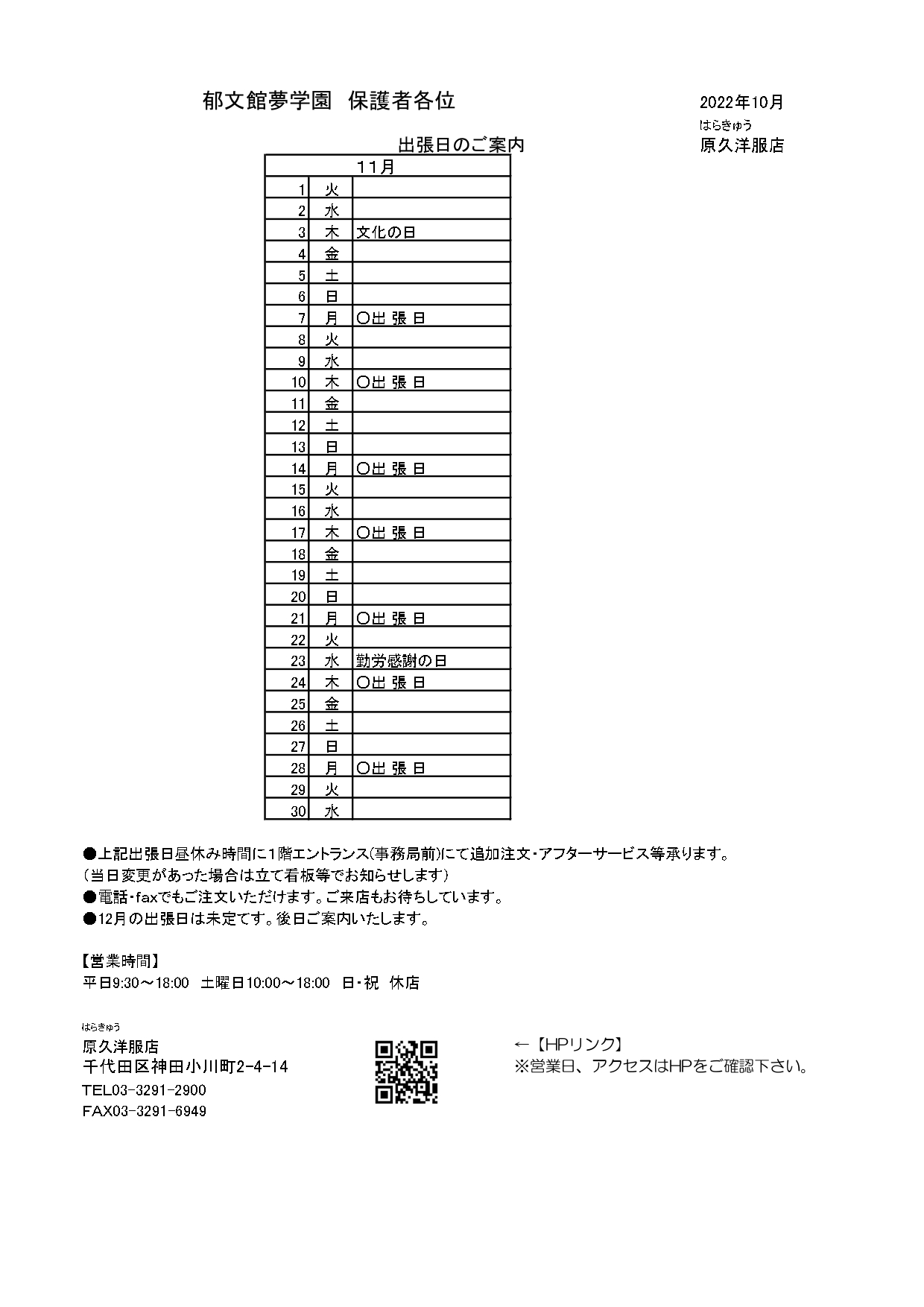 2022年11月 制服出張販売のご案内