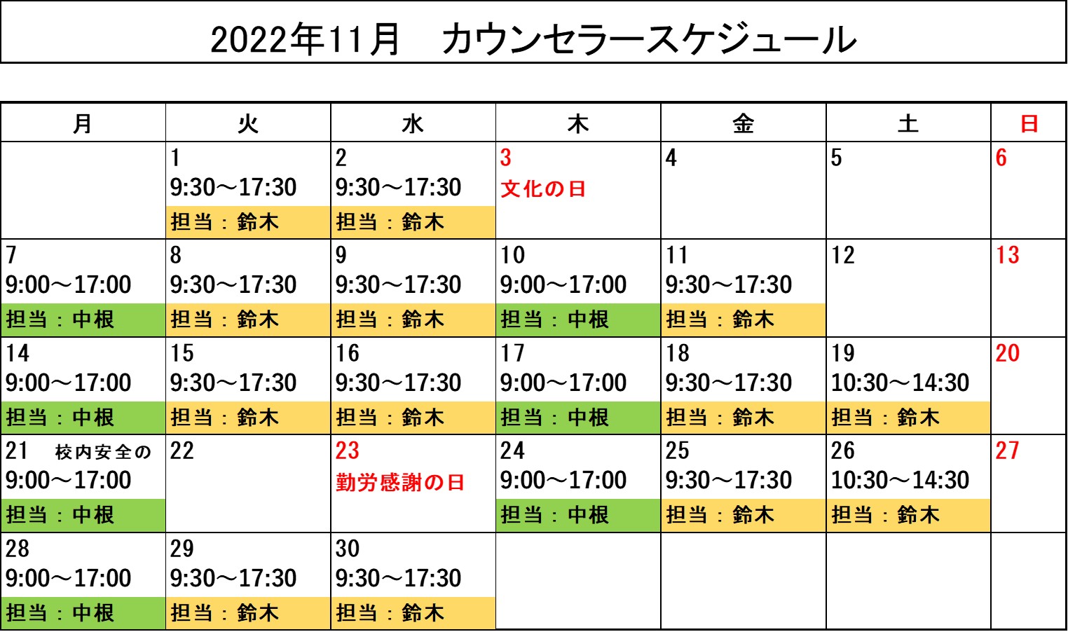 2022年11月カウンセラースケジュール
