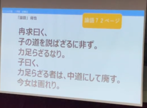 「冉求曰く、子の道を説ばざるに非ず、力足らざるなり。 子曰く、力足らざる者は、中道にして廃す。今女は画れり。」