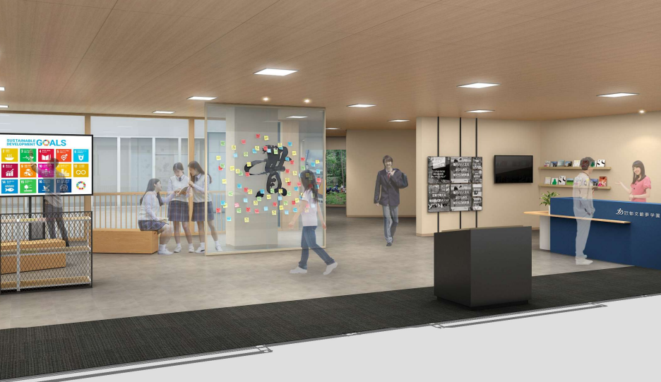 創立一三五周年を記念して学園校舎エントランスに「夢教育の軌跡」「SDGs教育日本一への取り組み」を紹介する常設展示エリアをお披露目します