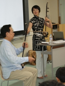 チェンミンさんは6月末まで産休をお取りになっていたので、運よくライヴを引き受けてくださいました。チェンミンさんは中国の蘇州生まれで、お父様は音楽教育家、お母様は越劇女優で、幼いころからお父様に二胡という楽器演奏の指導を受けていました。上海戯曲学校を卒業後、上海越劇オーケストラに入り、二胡奏者として活躍していましたが、単調な生活に疑問を感じ、新たな可能性を求めて、周囲の反対を押し切り、1991年に日本へ留学することを決意したそうです。留学後、猛勉強をして、日本語検定試験1級に合格し、93年に共立女子大学に入学して、日本文化を専攻なさったそうです。日本での生活の中で二胡の魅力を再認識し、大学卒業後に本格的に演奏活動を始めました。