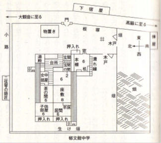 鏡子夫人の記憶による漱石邸の見取り図で、最上部(東側)に”下宿屋”と記されているのが蓬萊館で、そのみすぼらしい下宿屋が「群鶴館」という美しい名前と知り、小説の中で猫がつぶやきます。