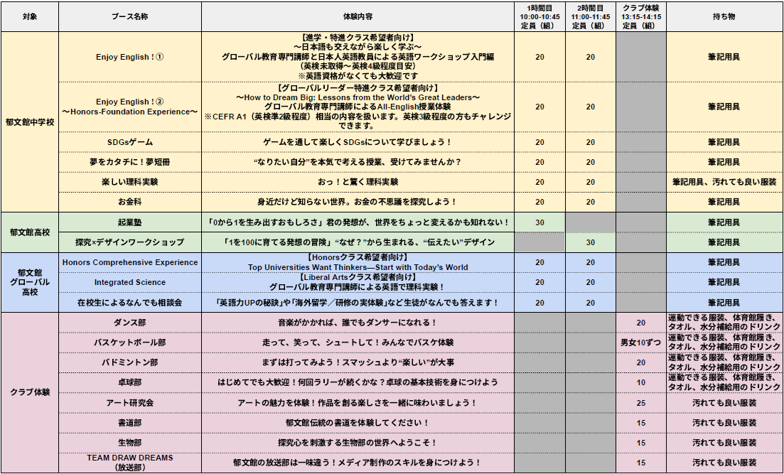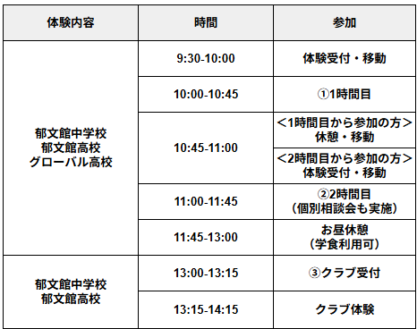郁文館の教育の根幹である「夢教育」を肌で感じていただけるイベントです。また、当日は夢食堂(学食)をご利用いただけます。入学後のイメージを膨らませながらぜひご活用ください。
