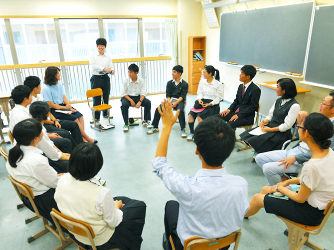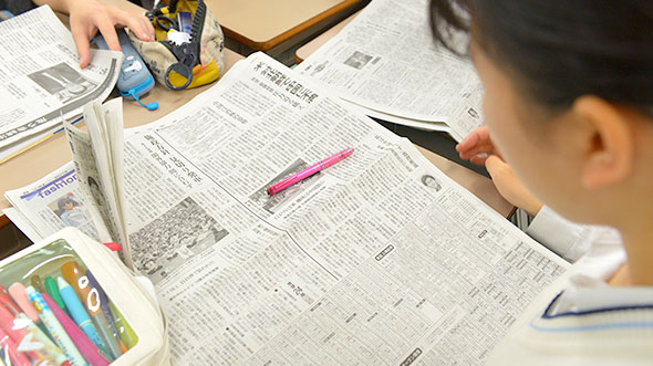 最初の10分間で、生徒が各家庭から持参する新聞(朝日・読売・毎日・産経・日経など)の記事から、各自、関心があるテーマをピックアップし、要約します。その後、グループに分かれて意見発表と意見交換を行います。時にはクラス全体、学年全体の前で「なぜそのテーマを選んだのか」、「どんな内容なのか」、「自分の意見は何なのか」、時間配分を考えながら論理的に述べることが求められます。