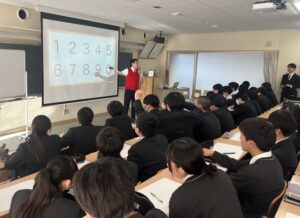 「英語や日本語など言葉には様々な種類があるけど、数字はどうだろう?」といった切り口で生徒の興味を引き付けると、生徒たちから「漢数字!」「ローマ数字!」と様々な答えが返ってきました。数字にも種類はいくつかありますが、数式に使うのは世界共通でアラビア数字です。「数字は1種類覚えるだけで、世界各国の子とお話ができる。だからこそ、面白くて奥深いんだ!」と話し、生徒たちから「確かに!」と共感の声が上がりました。