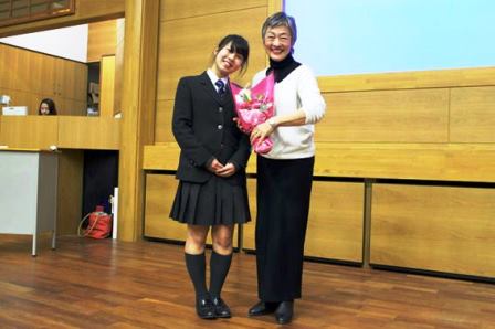 「僕は今、ビーズに凝っている。いろんな色のビーズをつないで丸くする。その中に鈴を入れる。鈴は僕。周りのビーズは友達、家族、先生、看護婦さん。いつも僕を守ってくれる。僕もいつかビーズになる。」 少年が書いた詞とともに、「2,395人の子どもたちの後ろには何万人もの子どもがいる。皆さんもその子どもたちと手をつないでみてください」というメッセージで締めくくられた講演の後には、なんだか温かい空気が漂っていたような気がします。 最後に、生徒の感想を紹介いたします。 ・「私は夢を叶えることが今まで助けてもらった人への恩返しだと思うので、夢を持ち実現することは本当に大切だと思います。」 ・「夢の実現はゴールではなくスタートである、という言葉にものすごく心が震えました。これからも夢を追い続けて頑張っていけると思いました。」 ・「苦痛を乗り越えて叶う夢というのはその人に新たな夢をあたえ、他人をも幸せにできる、ということを私もモットーにして日々生きていこうと思います。」