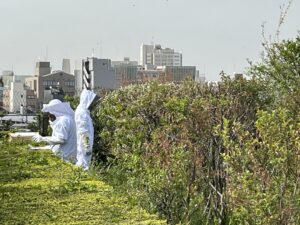 新しい環境での生活がはじまるミツバチたちは、少し気性が荒かったため、今回は防護服に身を包んだ先生たちが作業を担当。
