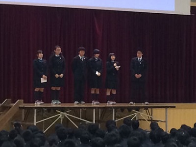 新学期が始まって初めての全校集会です。この日は、春休みに行われたハワイ研修や、カンボジア研修の報告が行われました。