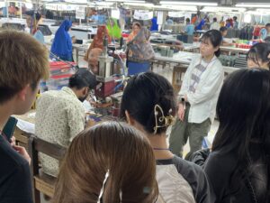 その後、日系企業が支援する縫製工場・牛革工場を訪れました。この工場では、精神疾患・病気を抱える方や学校に通えていない貧困層に対しての雇用を拡充しており、育休や託児所が完備されているなど福利厚生が充実している点に驚きの声が上がりました。