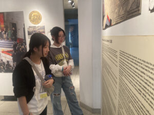 生徒たちはまず、ノーベル平和賞を受賞したムハマドユヌスさんが創設したグラミン銀行を見学。貧困層に対する融資を可能とした「マイクロクレジットプロジェクト」について学びました。洋服を作りたいと思っていてもミシンを買うことができなかった方が、お金を融資してもらうことによってビジネスを始められる仕組みと知り、生徒たちは展示されている資料を熱心に読んでいました。