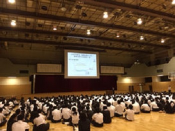村口社長はご自分の経験を基に、「なぜ起業するのか」「起業する上で最も重要なこと」、さらに、「志(=理念)が大切である」「何もないところ(ゼロ)に新たなものを創り出すことの意義」「JOB SEEKERとJOB MAKER」「自分は何者なのか」など、生徒たちが普段耳にすることができないような貴重なお話に傾聴し、熱心にメモを取っていました。