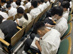 生徒たちは皆、理事長の話を熱心に聞きながら、メモを取っていました。