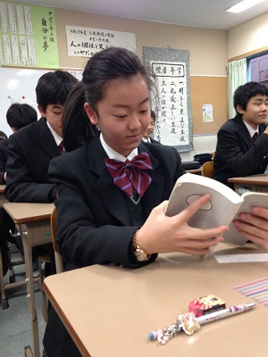 あと少しで先輩となる中学一年生達。「一生懸命」をモットーとする郁文館では、日本語や英語の本を持ってきて毎朝8時からHRが始まるまで「朝読書」をしています。生徒の中には朝読書だけで、月に三冊以上の本を読む生徒もいます。