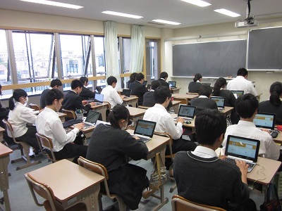 この時間では,これまでグローバル高校で行われていたNIE(新聞を読んで,記事に対する意見を発表しあう)や英語4技能型テストのためのリスニングテストなどが行われています。
