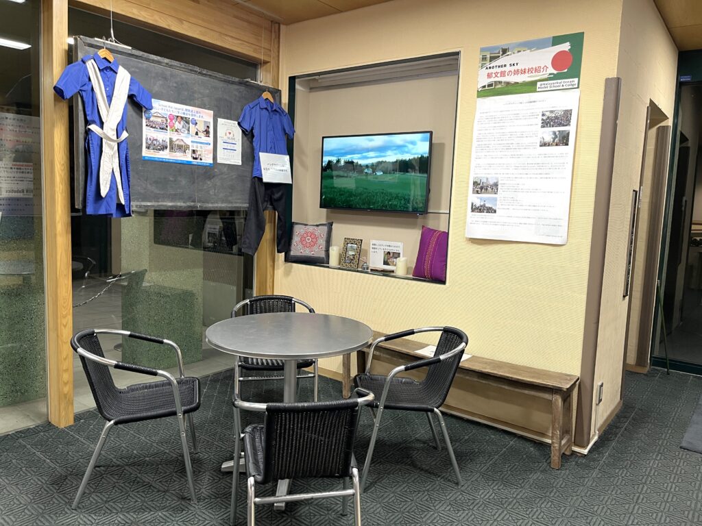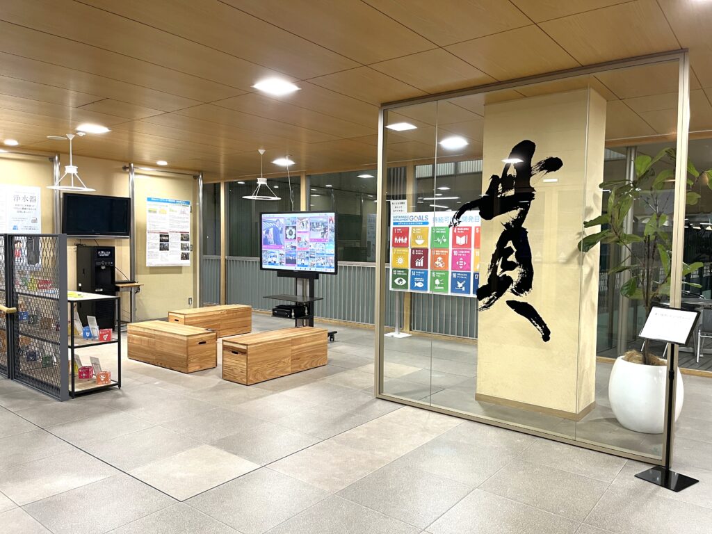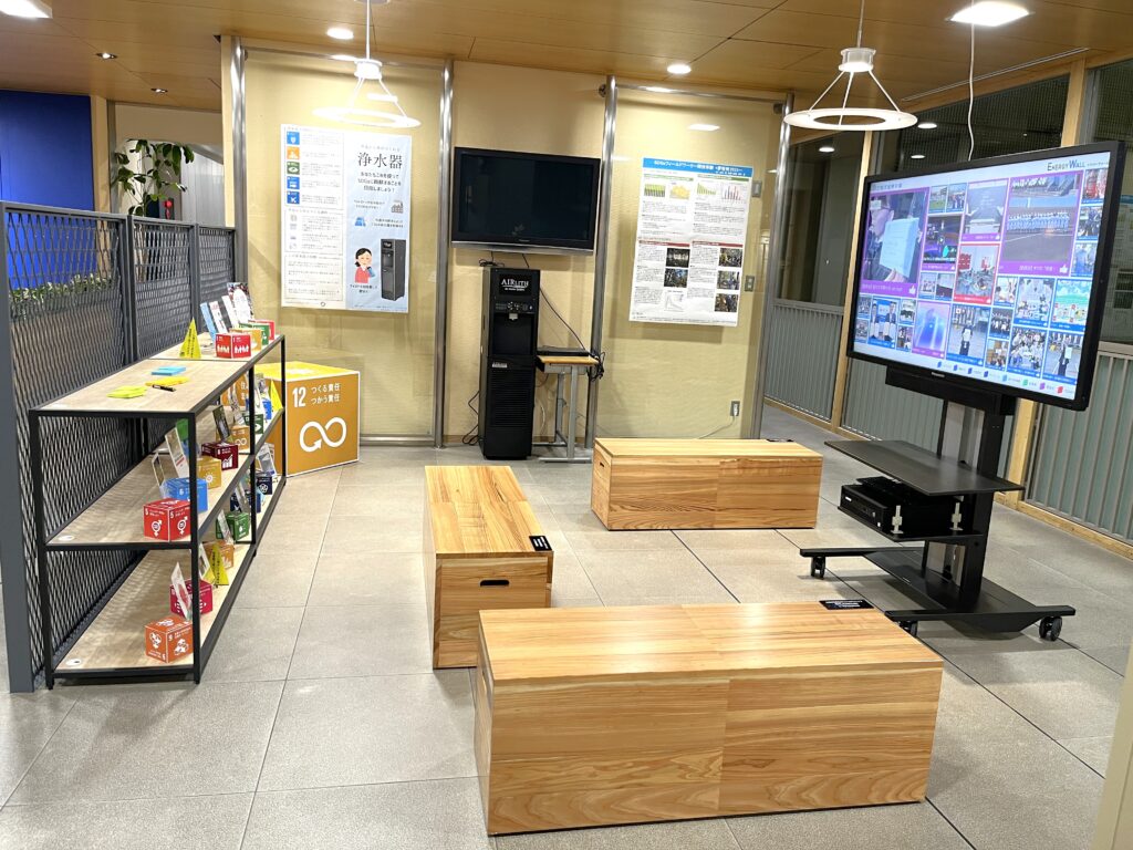 SDGs委員会*を中心とした生徒たちが間伐体験を行った木で作成したベンチに腰掛けながら、夢教育20年間で取り組んだアーカイブ記事や映像を、モニターを通して自由に閲覧することができるエリアです。過去の情報だけでなく、各校が今何に取り組んでいるのかを生徒が確認し、モニター上でイイねボタンを押すことで互いに応援することができます。また、空気から飲料水を作れる浄水器を設置することで、マイボトルの啓もう活動や、災害時でも安全な水源の確保ができる仕組みを形成しています。