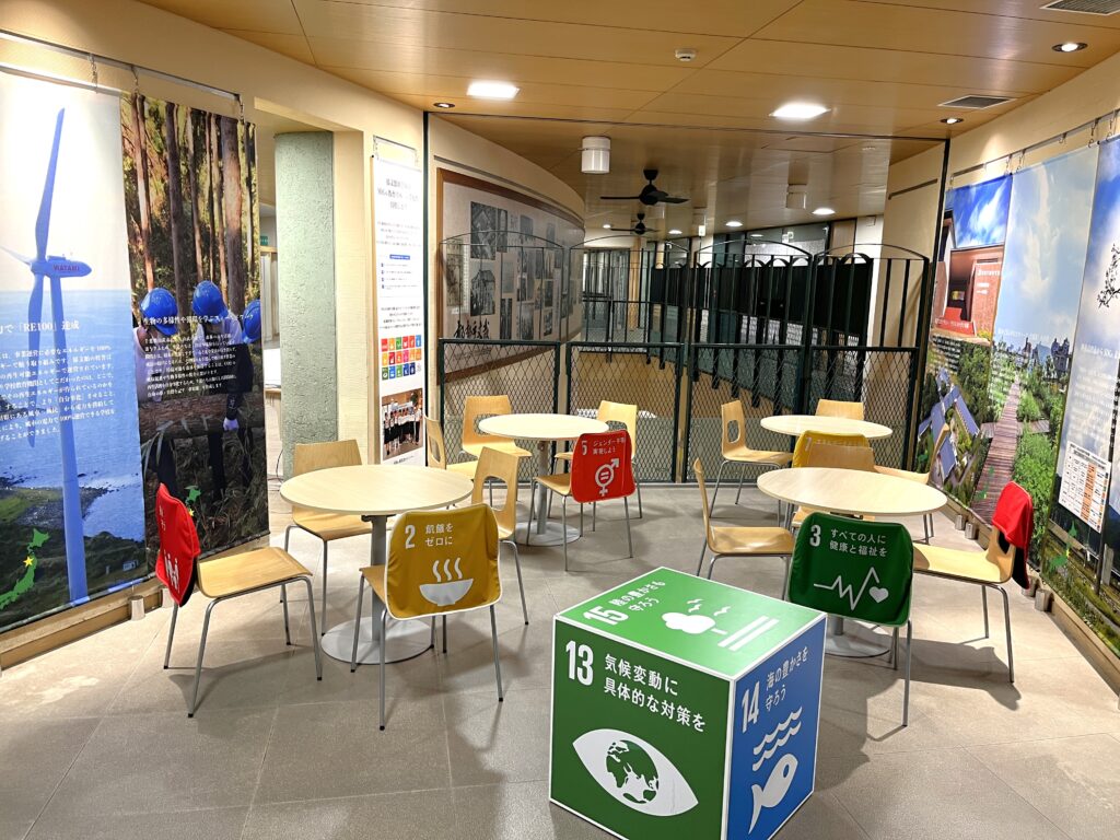本学園が、SDGs目標12〜15を実現するために取り組んでいる教育活動を「見える化」したエリアです。“100%風力発電で校舎を運営する「RE100」” や “持続可能な森林維持のために生徒たちが行う「間伐体験」” 、“土と触れ合う体験学習を通して教室での学びを深める「屋上庭園」” など、日本各地で行う実際の取り組み内容を視覚的に体験できます。緑豊かな雰囲気は、生徒の面談や歓談の場所としても利用できます。