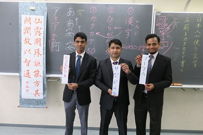 まず初めにNDMHSの先生方に日本文化を体験してもらうために,書道の授業を体験しました。書道科の東海林先生からペンの持ち方を教わり、片仮名で名前を書きました。来年度からバングラデシュに Japan International Dream School という、バングラデシュの生徒たちが日本に留学をするプログラムが組み込まれた学校ができるとのことで,そこでも書道教室を開きたいとおっしゃっていました。