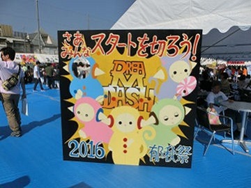 ●パンフレット表紙にも登場した、郁秋祭イメージキャラクター、夢叶(ドリム)くん達。彼らは、2000年後の郁文館の生徒会からやって来たとか。「顔ハメパネル」で5人目のメンバーになって記念撮影ができました。
