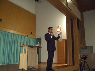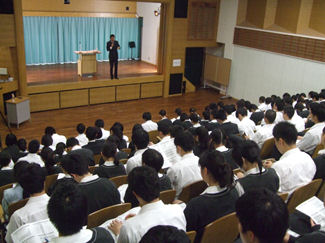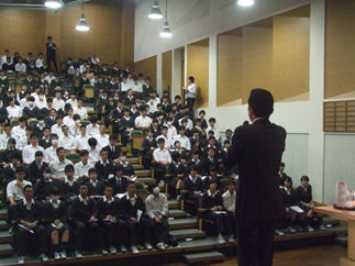 理事長先生は先ず、日本や世界の人口推移やGDP推移のデータをもとに、今後30年で起こる世界の変化についてお話しされました。中国、インドを筆頭に、インドネシアやフィリピンなど、アジアの中間所得層が爆発的に増加するというデータを見ただけでも、アジアを見ることの重要性が実感されました。その後、食糧や環境、観光など、国境を越えた物流が激しくなる中で、諸外国の人材と競っていかなくてはならない時代になるという現実の中で、日本の若者は諸外国の若者よりも極端に悲観的であるというデータが示され、「君たちは全員、価値ある人材だ。自信を持て。」と激励されました。生徒達は、大切なキーワードなどをメモしながら、理事長先生のお話を聞いていました。