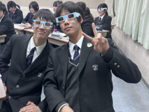 また加齢により水晶体が黄色く変色する「水晶体の黄変」を体験できるメガネを生徒たちに配布し、生徒たちはそのメガネをかけ、「黄色や寒色が見えない」「世界がいつもよりも濁って見える」といった声を上げながら、視覚の変化を実感しました。