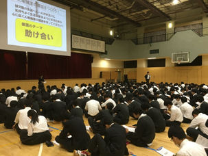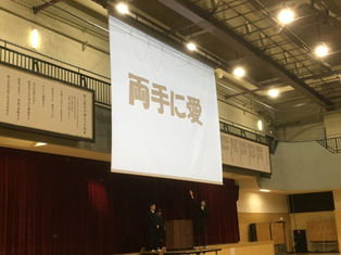 各クラスで考えた標語は、全校集会でも発表されました。そのときの様子です。