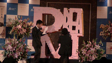 全在校生から多くの卒業生へのメッセージが紹介されました。(後のオブジェの赤い部分は、在校生が記入した付箋で埋め尽くされています。)