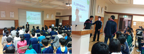 授業の主なねらいは、①気持ちを言葉で伝えることの大切さに気づく、②ただ伝えるのではなく言い方によって相手の気持ちが変わることを知る、③メールのマナーを学ぶ、という3点でした。自分も相手も気持ち良くなるような「にこ-にこ(win-win)になる伝え方」を学びました。具体的な場面を紹介して理解してもらう為に、各クラスの担任の先生が生徒役になって劇を行ったりしました。また、生徒ひとりひとりが自分だったらどんな風に表現するかワークシートに記入して、上手な気持ちの伝え方を考えて練習しました。メールのマナーについては、メールによる誤解をなくすために、「分かりやすく、ていねいに書く、強い言葉、紛らわしい言葉は使わない」ことを具体的な実例を使って学びました。