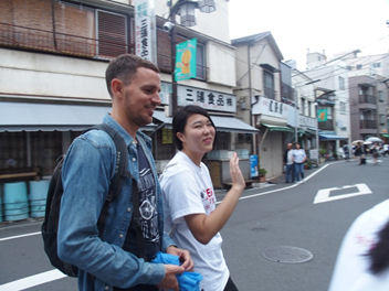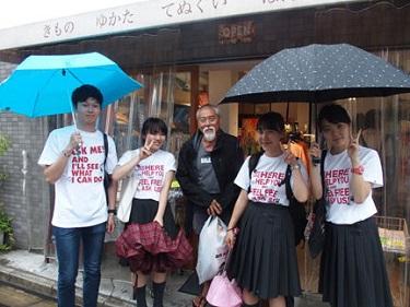 ハワイからいらした日系三世の方。「おばあさんの出身国の日本に一度来たかったんだ。」とご家族と一緒に初めての来日だそうです。メンバーが、お嬢さんの浴衣選びを手伝っている間に、残りメンバーが外で記念撮影。この後、根津神社までご案内したのですが、その途中、根津地域ではおみやげの「漬け物」選びにもおつきあいをしました。