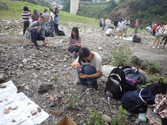 グループに別れて緑色岩や流紋岩、泥岩、凝灰岩、チャート岩、石灰岩、玄武岩など様々な種類の石を集めました。その後、堆積岩、火成岩、変成岩に分類し、岩石のできかたや特徴を自然観察員さんから教えていただきました。
